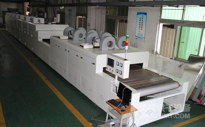 2、外形尺寸(約):總長24500mm*總高1740mm*總寬1890mm,地面到網(wǎng)帶的高度為950-1050mm,爐體內(nèi)進(jìn)料高度為150mm;烘干部分總長14000mm,分7段獨(dú)立控溫(每段4個測溫?zé)犭娕迹慷?000mm。冷卻段長4000mm,UV區(qū)2000mm,前后緩沖區(qū)各長500mm,進(jìn)料部分長2000mm,出料部分長1500mm, 爐體前后大梁上方裝有急停開關(guān),共4個。